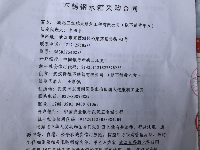 10月10日湖北三江航天建筑有限公司将武汉光谷激光科技园一期项目不锈钢消防水箱转包给我公司,并于湖北三江航天建筑有限公司签订《不锈钢水箱定制安装合同》。湖北三江航天建筑有限公司位于武汉市东西湖区柏泉农场商业街西正街54号,注册资金为5022.965万元万元,联系人是李四平。目前的经营范围是房屋建筑工程施工总承包(贰级);市政公用工程施工总承包(叁级);建筑防水工程专业承包(叁级);自有物资设备租赁、房屋租赁。合同约定付定金,工程材料进场安装完毕做试水合格后三天内付完余款,订立合同后,武汉舜德不锈钢水箱厂即按约定期限进场施工,采用包工包料含制作、安装、水箱基础槽钢及水箱配件含法兰(进水孔管、出水孔管、排污孔管、溢流孔管、透气孔管、检修孔、扶梯)以及运输、装卸、现场吊装到位,直至按装完毕。甲方要求不锈钢消防水箱焊接要保证无虚焊、无夹渣,焊条选用高于基材型号。表面光滑、无裂纹、焊缝无气泡,内衬结构排列要匀称,无毛刺。确保水箱各面保持垂直,垂直度不大于5%,水箱满载时箱壁无变形、无渗漏。水箱基础槽钢架及外梯稳定牢固,经久耐用。我公司于2019年10月15号如约完成该工程的施工,并于2019年15月18号试水合格。我们企业以过硬的质量、超前的技术、细致的服务做保障,真诚的为每一位用户服务,力争买一次产品,交长久朋友。着诚信务实、追求卓越、质量为本、科技兴业企业精神始终坚持以质量求生存,以信用求发展,以市场为导向,以诚信为原则的宗旨,赢得了广大客户的信誉和信任。