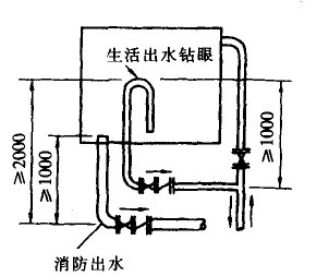 水箱的进、出水管宜分别设置,当进、出水管为同一条管道时,应在出水管上装设止回阀。当需要加装止回同时,应采取阻力较小的旋启式止回阀代替升降式止回阀,且标高应低于水箱低水位1m以上。生活与消防合用一个水箱时,消防出水管上的止回阎应低于生活出水虹吸管的管顶(低于此管顶时,生活虹吸管的真空被破坏,只保证消防出水管有水流出)至少2m,使其具备一定的压力推动止回阀。当火灾发生时,消防贮备水量才能真正发挥作用。
