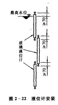 (6)液位计:一般应在水箱侧壁上安装玻璃液位计,用于就地指示水位。在—个液位计长度不够时,可上下安装2个或多个液位计。相邻2个液位计的重叠部分,不宜少于70 mm,见图2—22。若在水箱未装液位信号计时,可设信号管给出溢水信号。信号管一般自水箱侧壁接出,其设置高度应使其管内底与溢流管底或喇叭口溢流水面平齐。管径一般采用DNl5信号管可接至经常有人值班房间内的洗脸盆、洗涤盆等处。若水箱液位与水泵连锁,则在水箱侧壁或顶盖上安装液位继电器或信号器,常用的液位继电器或信号器有浮球式、杆式、电容式与浮平式等。