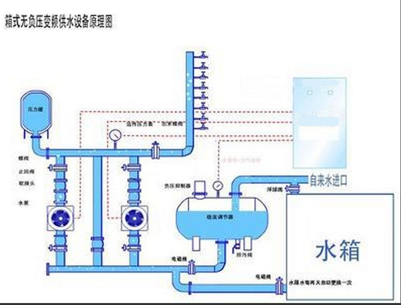 无负压变频供水设备材料选择SUS304板材,并且SUS304板材中的镍含量应大于等于8。管道采用SUS304材质,壁厚不低于3.0mm。艺优良、外观精美,经久耐用,价格合理。设备完全密封,不受二次污染,保证水质清洁卫生。