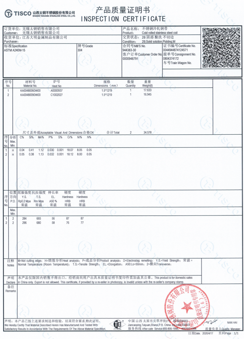 太钢304不锈钢水箱产品质量证明书